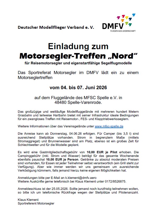 "Nord" findet statt: auf dem Fluggelände des MFSC Spelle e.V. in 48480 Spelle-Varenrode, Eßmoor. vom 04.06. bis 07.06.2026 ------------------------------------------------------------------- ![]() Einladung und Anmeldung |