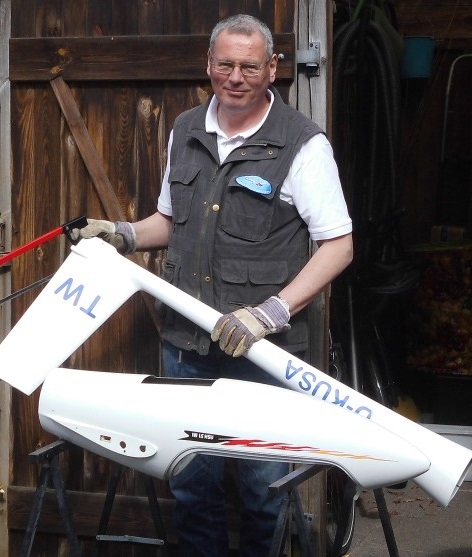 Erste Hochrechnungen ließen trotz des Maßstabs von 1:3 ein noch einigermaßen gut transportierbares Modell erwarten, wenn,………. ja wenn ich nicht, wie beim Original, Mittelrumpf, Innenfläche und Leitwerksträger nebst Leitwerken, am Stück bauen würde. Dann nämlich käme ein Teil von fast 2 Meter Länge, etwa 650 mm Breite und knapp 400 mm Höhe dabei heraus. Ein Ding, das auch in meinem SHARAN nicht mehr so ohne weiteres unterzubringen wäre. Zumindest nicht mit den nötigen Werkzeug- Sender- und Zubehörkoffern mit Akkus und Ladetechnik, sowie etwas Urlaubsgepäck. Aber deswegen auf einen Kleinbus umzusteigen kam mir auch nicht in den Sinn. Also hieß es das Modell zerlegbar zu gestalten, was im Übrigen dann auch recht einfach gelang. Weil mir als Rentner jetzt allerdings keine große Werkstatt, keine Absauge für Stäube und Dämpfe und schon gar nicht mehr die Nutzung des Maschinenparks, bis hin zum Autoklaven zur Verfügung stehen, schied die Variante mit Urmodell- und Formenbau, sowie einem Rumpf in Faserverbundbauweise von vornherein aus. Allerdings befand ich, nach kurzer Recherche im Internet, das Rumpfvorderteil einer ASH 31 von den Maßen und Proportionen her als durchaus recht ähnlich. Nur die Rumpfnase könnte ein paar Zentimeter länger und etwas spitzer sein. Doch würde das auffallen? Und viel wichtiger, gab es einen gebrauchten ASH 31 Rumpf in 1:3 irgendwo günstig zu kaufen? Das rc-network Forum half da weiter. Nur wenige Stunden nach meinem Aufruf erhielt ich die erste positive Antwort. Es gab einen Rumpf in entsprechender Größe, der nach einer Crashlandung hauptsächlich hinter den Flächen im Leitwerksträger gestaucht und gerissen war. Auch der GFK Haubenrahmen hatte an zwei Stellen winzige Risse und die Haube selbst müsste neu gekauft werden. Ob ich den denn haben wolle? Na klar wollte ich, zumal die Entfernung zur Abholung unter 100 km betrug. Für einen Freundschaftspreis konnte ich den Rumpf dann gleich mitnehmen, nachdem ich dem Pechvogel zu seinem Bruch mein Beileid ausgesprochen hatte.