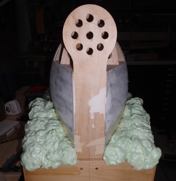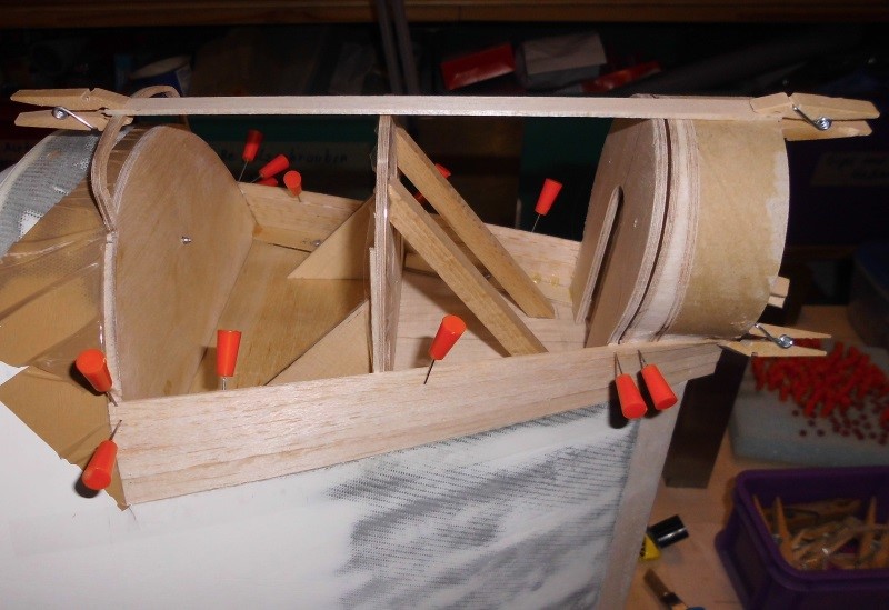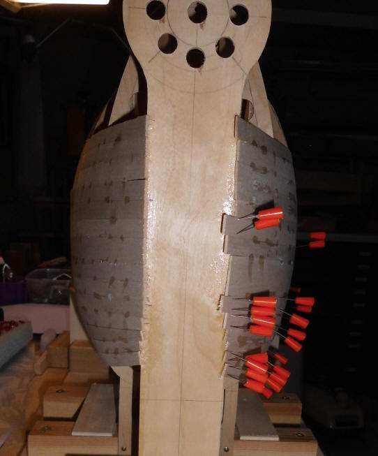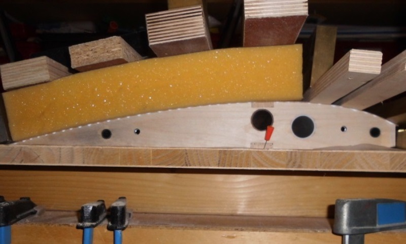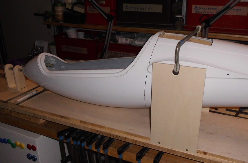 Anschließend habe ich den Rumpfkopf noch einmal mit meinen Unterlagen und dem Aufriss im Maßstab 1:3 verglichen und ihn anschließend auf einer Helling aufgebockt. Dazu konnte ich gut die noch vorhandenen Durchbrüche für den Flächenstahl, sowie die Bohrung der Schleppkupplung in der Nase verwenden. So akkurat in Dreipunktlage auf der Helling aufgebockt nahm ich die weiteren Schritte in Angriff. Um der doch ein wenig wackeligen Geschichte für den Weiterbau einen vernünftigen Halt und vor allem eine sichere Zentrierung zu verpassen, habe ich unter dem Rumpf einige Halbspanten auf das Hellingbrett geleimt. Mit ein paar seitlichen Streben zur Fixierung auf der Mittellinie und einer Querleiste darüber, die den Haubenausschnitt exakt in der waagerechten hält, sah das schon mal ganz ordentlich aus.