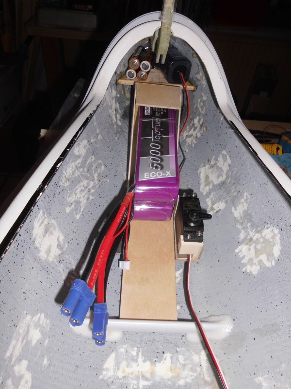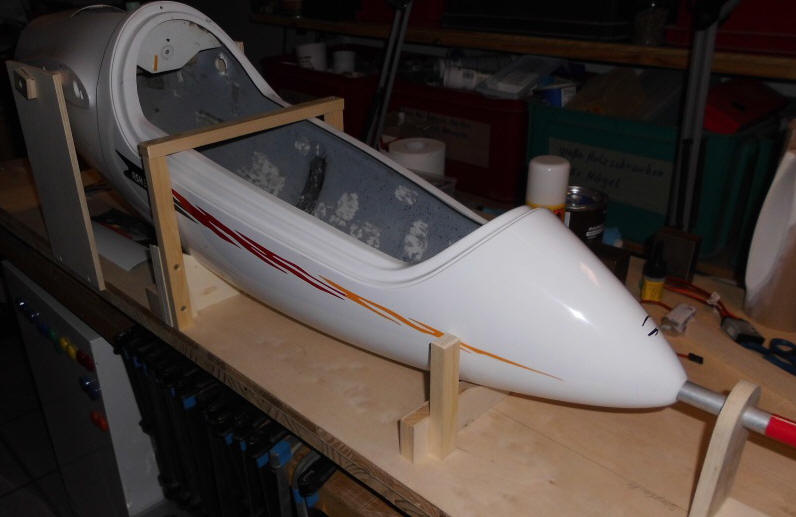 Das hintere Ende des Rumpfes wurde anschließend in mehreren Schritten mittels eines Metallsägeblatts Stück für Stück weg gesägt. Dabei wurden, außer den alten Flächenanformungen, gleich auch die noch vorhandenen Verstärkungen und Einbauten für das vorher verwendete Klapptriebwerk mit entfernt. Was dann noch an Einbauten im Rumpf verblieb, wurde mit Fräsern und Schleifdornen herausgedremelt, oder wie die vorhandene Akkuhalterung, für den neuen Motorsegler auch Verwendung finden.