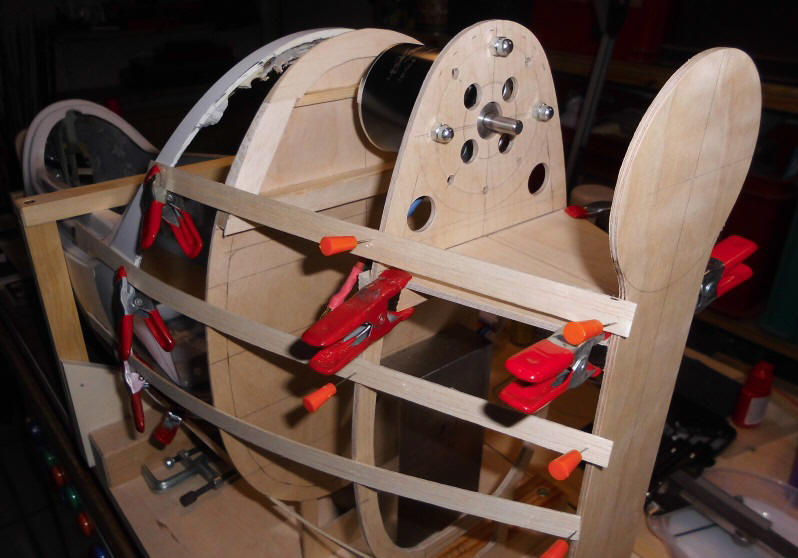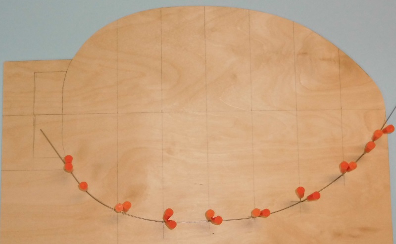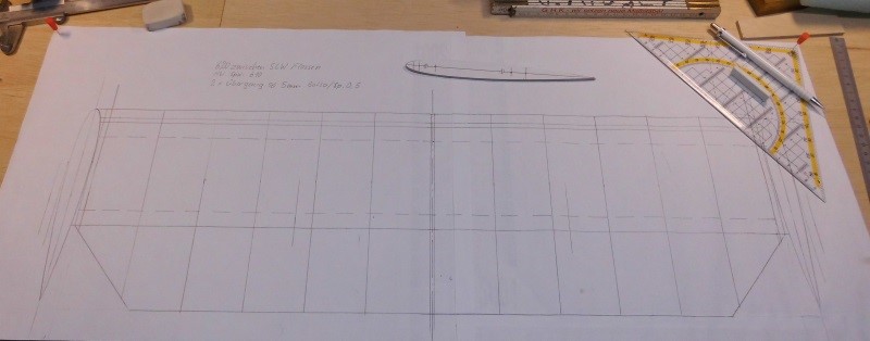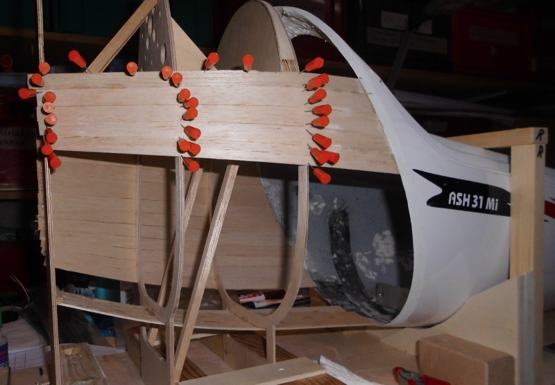 Die neue Heckkontur wurde mit drei formgebenden Spanten, die natürlich auch den Motor, sowie die neue Flächensteckung in Tiefdeckeranordnung aufnehmen mussten, in Angriff genommen. Dazu wurde ein Abschlussspant an der Stelle auf die Helling geschraubt, an der der neue MoSe-Rumpf enden würde. Dann habe ich versuchsweise mit ein paar Leisten ausprobiert, wie die Linien zwischen diesem Endspant und dem Rumpfkopf harmonisch verlaufen. Ein zufällig vorhandenes Stück eines Papprohres das auch noch fast den passenden Durchmesser aufwies, übernahm für die weitere Planung zunächst provisorisch die Stelle der Motorverkleidung. Die ist auch am Original kreisrund und ermöglicht, mit ihrer Haifischmaul ähnlichen Öffnung, oben, gleich hinter der Kabinenhaube, die Kühlluftzufuhr zum Antrieb. Der Spant, der oben auch als Motorträger fungiert, wurde dann mittels einer simplen Schablone konstruiert. Dazu genügte es oben den Durchmesser der Motorverkleidung anzuzeichnen und anschließend die Koordinaten zu übertragen, an denen die provisorischen Strakleisten die Kontur bereits vorgaben. Danach alle Punkte mit Nadeln markieren und diese zum Schluss mittels eines darüber gespannten 0,8 mm Stahldrahtes sauber zu einer schönen geschwungenen Kurve verbinden. Innerhalb einer halben Stunde entstand so die linke Hälfte der Schablone, die nur noch über die Mittellinie gespiegelt zu werden brauchte. Im unteren Bereich würde dieser Spant später auch die hintere Flächensteckung aufnehmen. Der Spant davor entstand in gleicher Weise. Er würde später an seiner Oberseite, ganz wie beim Vorbild, die Hutze für die Kühlluftzufuhr zum Motor bilden. Aus Gewichtsgründen habe ich den Antriebsmotor nicht wie beim Original hinten am Rumpfende positioniert, sondern weiter vorn, gleich hinter der Kabinenhaube. Schließlich wird im Modell kein maßstäbliches, kiloschweres biologisches Material vor dem Schwerpunkt mitfliegen. Außerdem würden die beiden Leitwerksträger hinten noch genügend Gewicht mitbringen, da kann es nicht schaden die schweren Komponenten möglichst vor, oder zumindest so dicht wie möglich am Schwerpunkt einzuplanen. Außerdem liegt die neue Tragfläche in Tiefdecker Anordnung auch ein gutes Stück weiter vorn als die alte Seglertragfläche der ASH 31. Die deswegen benötigte Wellenverlängerung zwischen Motor und Propeller sowie ein zusätzliches Lager am Endspant wären technisch kein großes Problem. Und die Antriebsakkus können später auf dem Rumpfboden zur Schwerpunkteinstellung notfalls weiträumig verschoben werden.