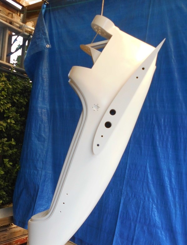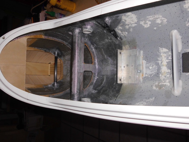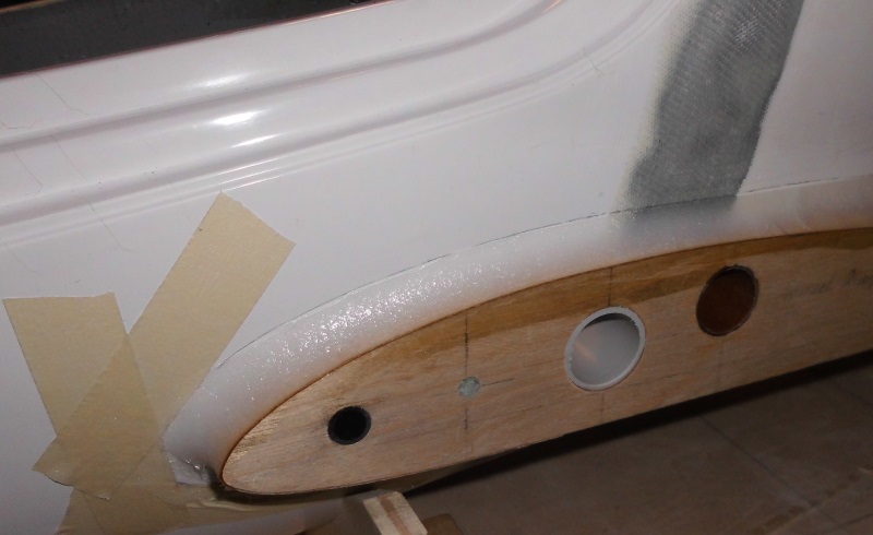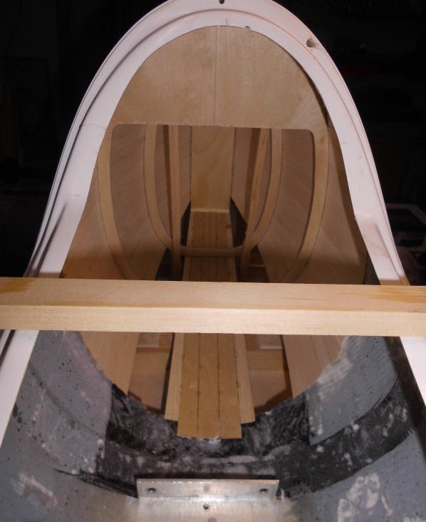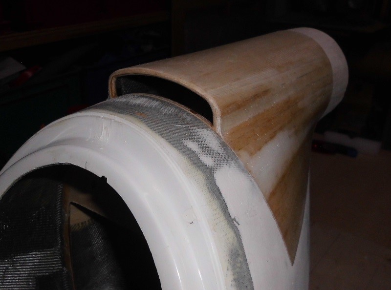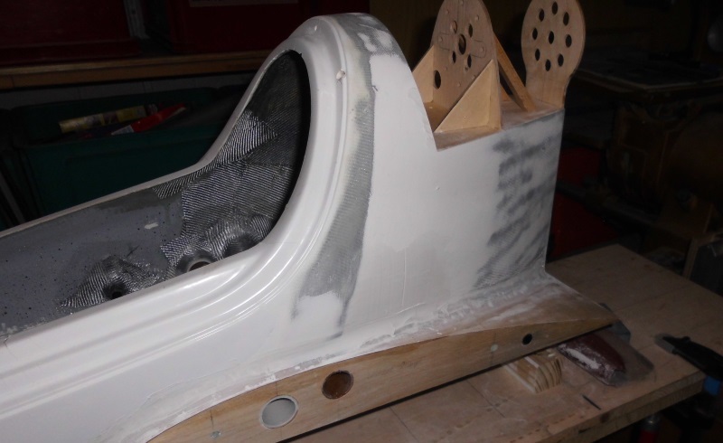 Als nächstes habe ich den Rumpf von innen gut angeschliffen und die Wandstärke dabei auf etwa 1 mm auslaufend gebracht. Außen habe ich anschließend die Gelcoatschicht auf etwa 20 mm Breite keilförmig bis auf Null weggeschliffen, und so eine Möglichkeit geschaffen den späteren, äußeren Überzug aus Glasseide, sauber und kraftschlüssig an das Vorderteil anzuschäften. Über die drei neuen Spanten und ein paar Verstärkungen habe ich anschließend eine Rumpfbeplankung, aus hartem 1,5 mm Balsaholz, Streifen für Streifen aufgebracht. Sie wurde von innen in den Rumpfkopf und außen auf den Spanten verklebt. Aufs alte Vorderteil überlappend, wurde darauf dann, mit einer mehrlagigen GFK Außenhaut in Positivbauweise, die Oberfläche verstärkt und das gesamte neue Heck ans vorhandene Vorderteil angebunden. Aber auch innen wurde der hintere Rumpf, wiederum nach vorn gut überlappend, mit zwei Lagen Glasseide komplett aus laminiert. So bildet die vorläufige Balsabeplankung nun nur das Stützmaterial für den hinten, im Sandwich ausgeführten Rumpf. Nachdem ein paar kleine Unebenheiten und Absätze an den Übergangsstellen mit Spachtelmasse schön angeglichen und ausgestrakt waren ging‘s ans schleifen. So hatte ich nach etlichen Stunden, dieser von keinem geliebten Arbeit, sowie einem letzten Überzug aus einer 80 g Glasseide, einen schönen GFK Rumpf Rohbau vorliegen.