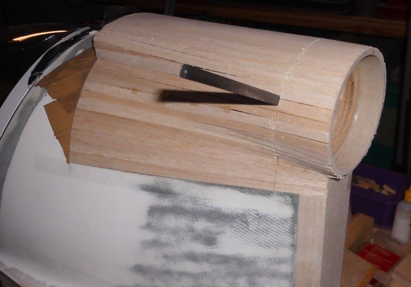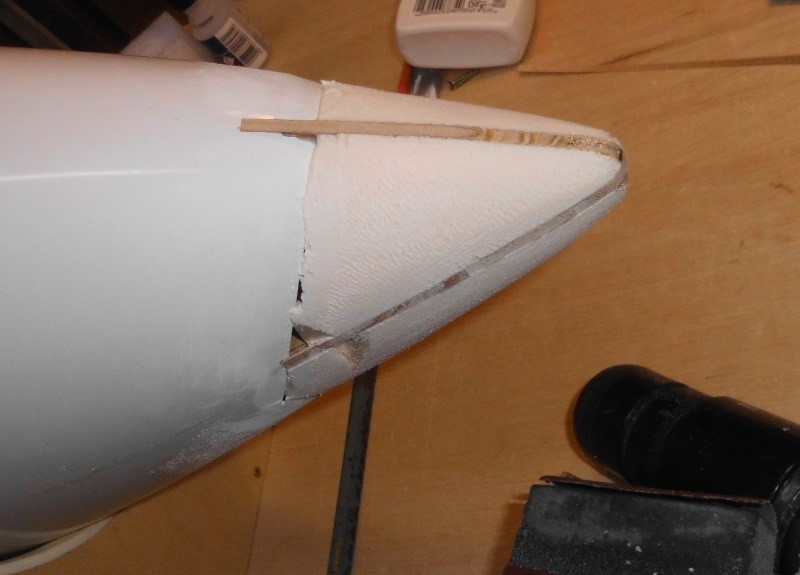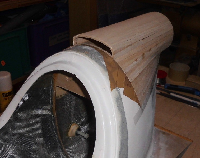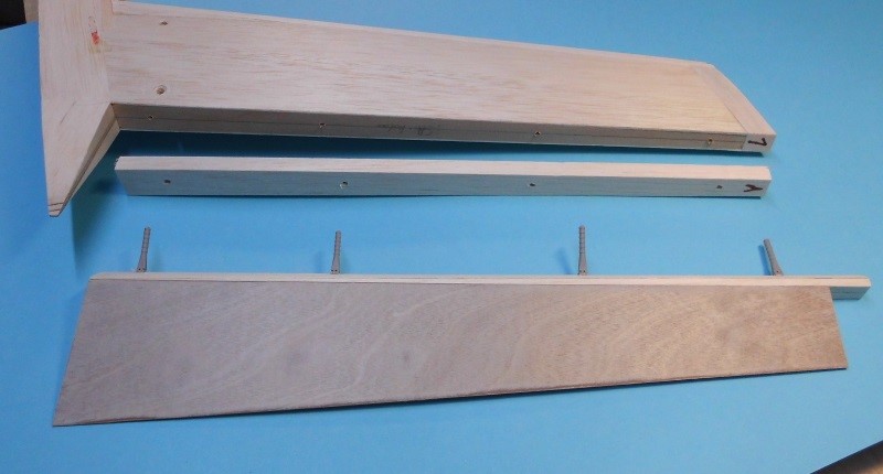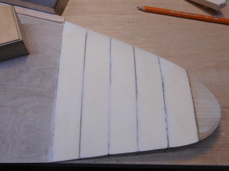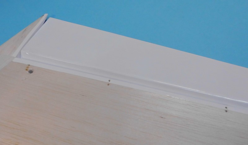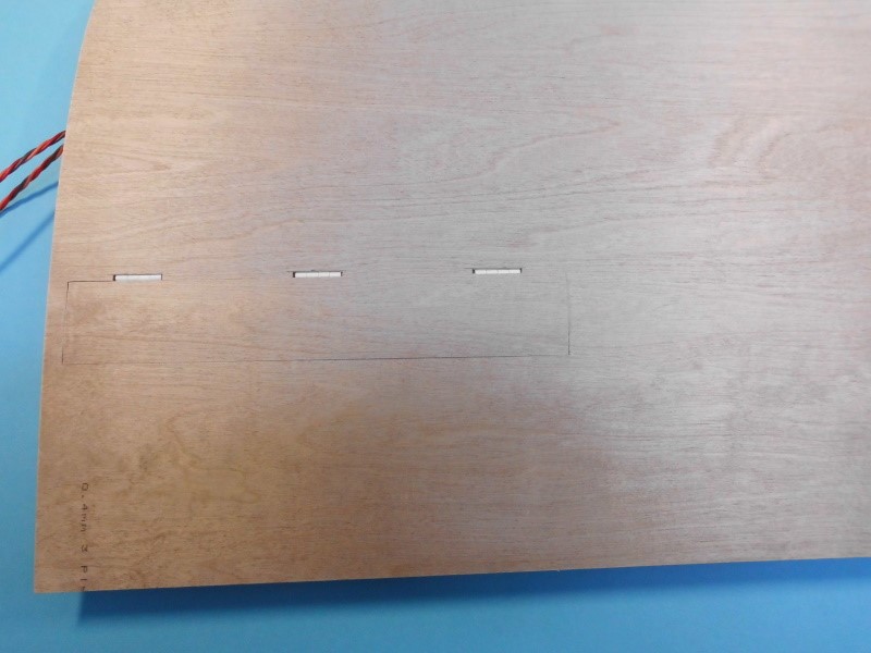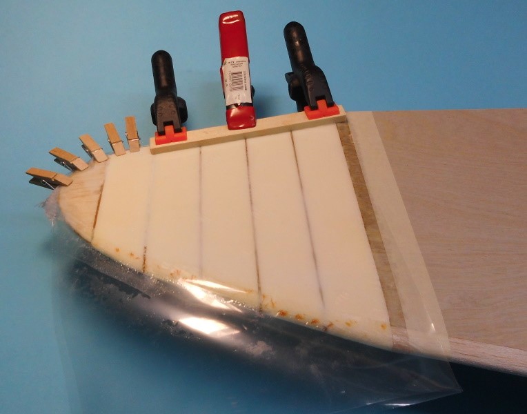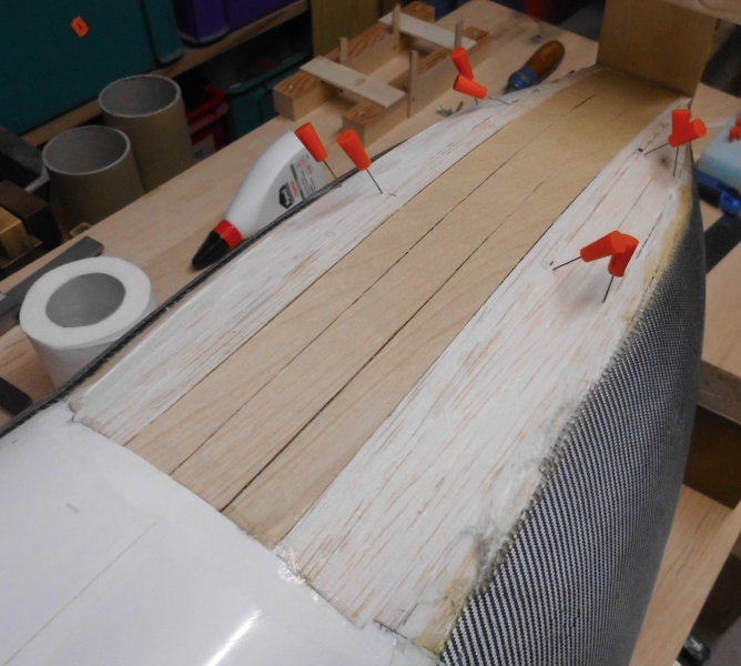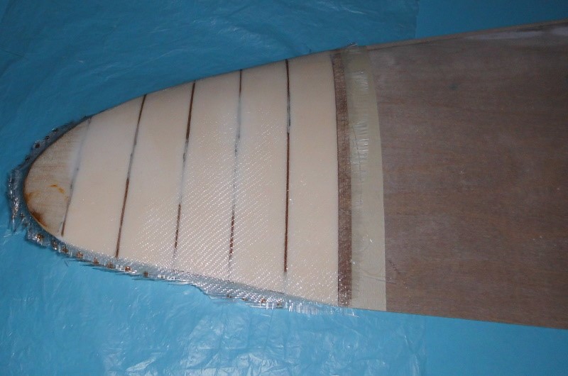 Als nächstes habe ich die bereits im Vorwege geschäftete und verleimte Unterseitenbeplankung bis zur Höhe vom Holm drunter geleimt. Anschließend, nach der Leimtrocknung über Nacht, konnte ich die restliche Beplankung zwischen Holm und Nasenleiste mittels genau passenden, kleiner Balsakeile hochdrücken und von innen mit dünnflüssigem Sekundenkleber verkleben.