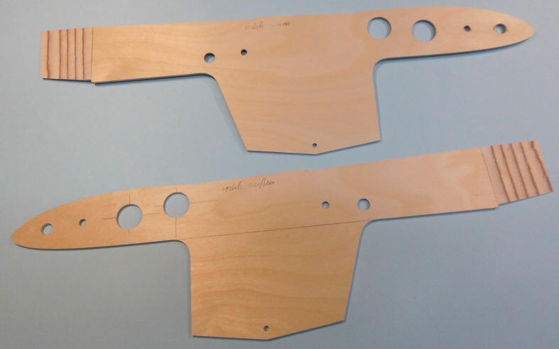 Nachdem mein Haus-Lieferant das weitere notwendige Sperrholz viel früher als angegeben geliefert hat, geht es mit den Seitenwangen für die Leitwerksträger los. Nach einem ersten Muster werden gleich anschließend die nächsten drei Stück angezeichnet und ausgesägt. Über die Bohrung des Steckungsrohres und der Verdrehsicherung ausgerichtet, können nun gleich alle vier Teile gemeinsam an der Tellerschleifmaschine auf Maß gebracht werden. Dann wird hinten die Schäftung über 50 mm angeschliffen, werden die Zwischenstege die das Radhaus abteilen aufgeleimt und ein paar Stunden später die Lager für die Servos. Auch finden sich noch weitere Klötzchen, die dorthin kommen, wo später die Schrauben sitzen, die die LWT mit den Innenflügeln verbinden werden.