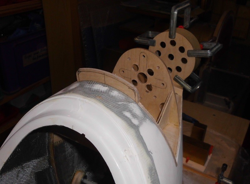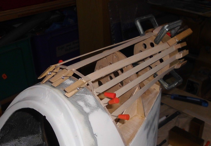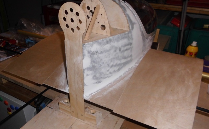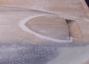 Die nächst Aufgabe war, den Flächenübergang sauber anzuarbeiten. Ich hatte mich ja entschlossen auch hier wieder mein Lieblingsprofil, das Clark-Y zu verwenden. Zwar bringen andere Profile, wie etwa das Wortmann FX 60-126, das wegen seiner ähnlichen Werte wie Wölbung und Dicke auch in die Auswahl kam, sicher mehr Leistung, sind jedoch wegen der hohlen Unterseite, in Rippenbauweise um einiges schwieriger aufzubauen. Das gilt auch für die in die engere Auswahl gekommenen HQ Profile. Auch hier wird’s, in Rippenbauweise, ohne eine Helling schwierig, oder zumindest um einiges aufwendiger. So ein Clark-Y baut sich, wegen seiner größtenteils ebenen Unterseite, auf einem geraden Baubrett, wenigstens fast von allein. Und so schlecht sind dessen Leistungen ja nun auch nicht. Schließlich baue ich hier keinen Hochleistungs- sondern einen Motorsegler. Da sind gutmütige Abrisseigenschaften und ein narrensicheres Flugverhalten nicht zu verachten. Und wenn die Thermik ausbleibt geht man eben notfalls mit Akkuthermik wieder auf Höhe. Außerdem konnte ich in dem 11,7% dicken Clark-Y die Flächensteckung mittels 25er Rohr noch im Holm unterbringen. Die Wurzelrippen aus 4mm Flugzeugsperrholz in einer Tiefe von 400mm waren schnell ausgesägt und die nötigen Durchbrüche für Steckung, Verdrehsicherung, Drucksteg und Kabeldurchführung mittels Forstnerbohrer sauber eingebracht. Auf einem ebenen, parallelen Hilfsunterbau auf der Helling, konnten die Wurzelrippen sauber ausgerichtet werden und sämtliche Durchbrüche zum Rumpf wurden übertragen und ausgearbeitet. Danach habe ich mittels einer simplen Pappschablone die Kontur der Unterseitenbeplankung ermittelt und diese, auf dem Hilfsunterbau aufliegend, mit angedicktem Harz mit dem Rumpf verklebt. Dem exakten ausrichten der Steckung, der Wurzelrippen und sämtlicher weiterer Verbindungen, folgte das einkleben mit angedicktem Harz. Dabei wurden auch gleich die Wurzelrippen, sowie die diagonalen Hilfsrippen mit der Unterseitenbeplankung verklebt. Alle Verklebungen im Rumpf wurden anschließend innen gut mit Glasseidenstücken an die Rumpfschale laminiert, sodass sich eine feste und sichere Verbindung aller Bauteile ergab. Nach dem verputzen der Glasgewebekanten und Stöße im Rumpf, habe ich ihn außen, außerhalb der Profilkontur mit Krepp abgeklebt und die Zwischenräume zwischen Rumpf und Wurzel- sowie Zwischenrippe mit 2-K-Bauschaum ausgeschäumt. Nachdem dieser ausgehärtet war, konnte ich mit einem Messer den überschüssigen Schaum grob wegschneiden und die Schaumoberfläche sauber bündig mit den Wurzel- und Diagonalrippen verschleifen. Für die Oberseitenbeplankung passte ich wiederum Schablonen an und schnitt danach das 0,4 mm Sperrholz zu. Zunächst das hintere Ende, von der Endleiste bis etwa zur Kabeldurchführung. Die Beplankung wurde mit Hilfe zusätzlicher Beilagen und vielen kleinen Zwingen, sowie Gewichten, auf Wurzel und Diagonalrippe aufgeklebt. Danach kamen die vorderen Bereiche an die Reihe, die in einem Stück, um die Nasenleiste herum, bis an den Beginn der Unterseitenbeplankung aufgezogen wurden. Dazu war es erforderlich das Sperrholz in heißem Wasser gut zu wässern und in einer kleinen Schablone über Nacht vorzuformen. Um den Übergang zwischen Profil und Rumpf weich auszuformen, musste nun dazwischen eine Hohlkehle gezogen werden. Mittels angedicktem Harz und einer Schablone zum Ziehen, gelang das bereits im ersten Durchgang relativ gut. Nach leichtem überschleifen der ausgehärteten Mischung, erfolgte am nächsten Tag ein zweiter Auftrag, der die Hohlkehle komplett geformt hat. Ein wenig Schleifarbeit blieb noch, sowie ein nachspachteln an einigen kleinen Fehlstellen. Dann war der Rumpf, bis auf die Motorabdeckung praktisch fertig für den abschließenden Überzug mit einer 80g Glasseide.
