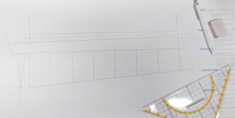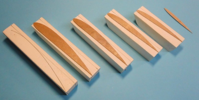 Damit ist das Stichwort Leitwerksträger gefallen und deren Baubeginn folgt. Das bedeutet allerdings, dass jetzt die nächsten Arbeiten immer doppelt anfallen. Und jeder dieser Leitwerksträger entspricht von Art, Größe und Aufwand etwa einem mittleren Seglerrumpf. Genau wie die Innenflächen auf die Steckung aufgefädelt und durch die Verdrehsicherung gehalten, haben sie im vorderen Bereich die Profilkontur der Flügel. Die notwendigen Rippen konnte ich deswegen von den Wurzelrippen der Außenflügel übernehmen. Allerdings werden sie im mittleren Bereich, unten heraus, gleich als Fahrwerkträger ausgebildet.