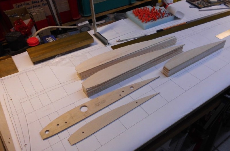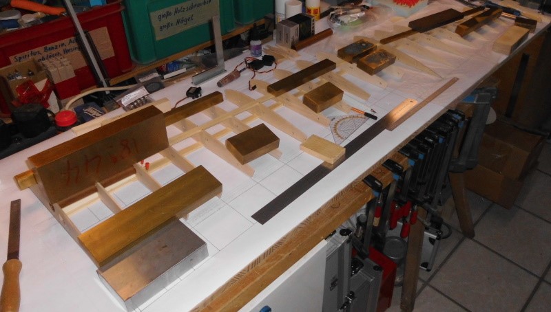 Da ich jetzt aber erst einmal genug hatte, von Glasseide, Harz und Spachtelmasse, stand mir der Sinn nach Holzarbeit. Was lag also näher als die beiden Innenflügel anzufangen. Beim Zuschneiden der Wurzelrippen für den Flächenübergang am Rumpf, hatte ich in weiser Voraussicht auch gleich die notwendigen Sperrholzrippen für die Innen- und Außenflügel mit gefertigt. Schließlich ist dieser Bereich ja ein Rechteckflügel und beim zusägen und schleifen im Paket ist es nahezu unerheblich wie viele Lagen Sperrholz da bearbeitet werden.