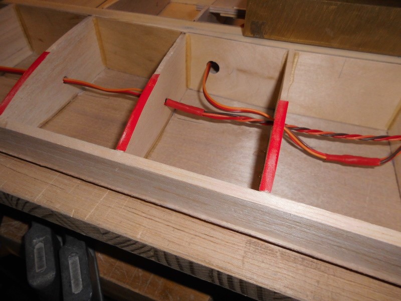 denn Schiebelandungen kommen leider ja immer einmal vor. Glücklicherweise bekam ich Räder, die nur knapp 27mm breit sind. So brauchte ich in der Breite der Radverkleidungen nur um 3 mm zu schummeln. Aber bei mir geht Alltagstauglichkeit immer vor Maßstäblichkeit. Zudem sieht man die Radhäuser später, wenn sie komplett sind, auch nur beim Überflug. Wenn das Modell am Boden steht ist davon, wegen der Tiefdeckeranordnung, sowieso nichts zu erkennen. Die Rippen müssen, nach hinten oben hinaus, verlängert werden, um eine möglichst gute und lange Schäftung zum eigentlichen Leitwerksträger zu ermöglichen. Als letzte Forderung müssen natürlich auch jeweils noch 2 Servos, nämlich die für Seiten- und Höhenruder dort ihre Plätze finden. Jedes Seitenruder wird über ein eigenes Servo angelenkt. Das schafft Redundanz falls doch einmal eines ausfallen sollte. Aus dem gleichen Grund werden auch zwei Höhenruderservos verwendet und das Höhenruder mittig geteilt. Wer nämlich einmal mit einem halben Höhenruder landen durfte; die äußerst mangelhafte Steuerung um die Querachse wurde hilfsweise durch die Störklappen unterstützt; wird diese Maßnahme sicher verstehen. Da ist dann im Notfall wenigstens ein halbes Höhenruder zumindest noch eine echte Hilfe. Und viel mehr Bauaufwand bedeutet es auch nicht. Außerdem passen die notwendigen, aber jetzt kleineren Servos, besser in die schmalen Leitwerksträger hinein.