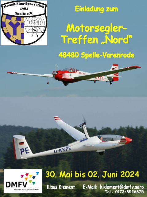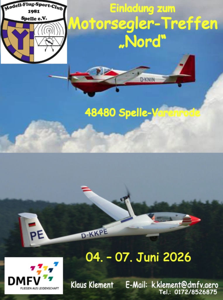 "Nord" findet statt: auf dem Fluggelände des MFSC Spelle e.V. in 48480 Spelle-Varenrode, Eßmoor. vom 04.06. bis 07.06.2026 ------------------------------------------------------------------- ![]() Einladung und Anmeldung |