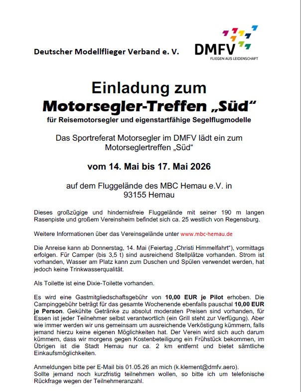 "Süd" auf dem Fluggelände des MBC-Hemau e.V. in 93155 Hemau, Am Tangrintel. vom 14.05. bis 17.05.2026 |
